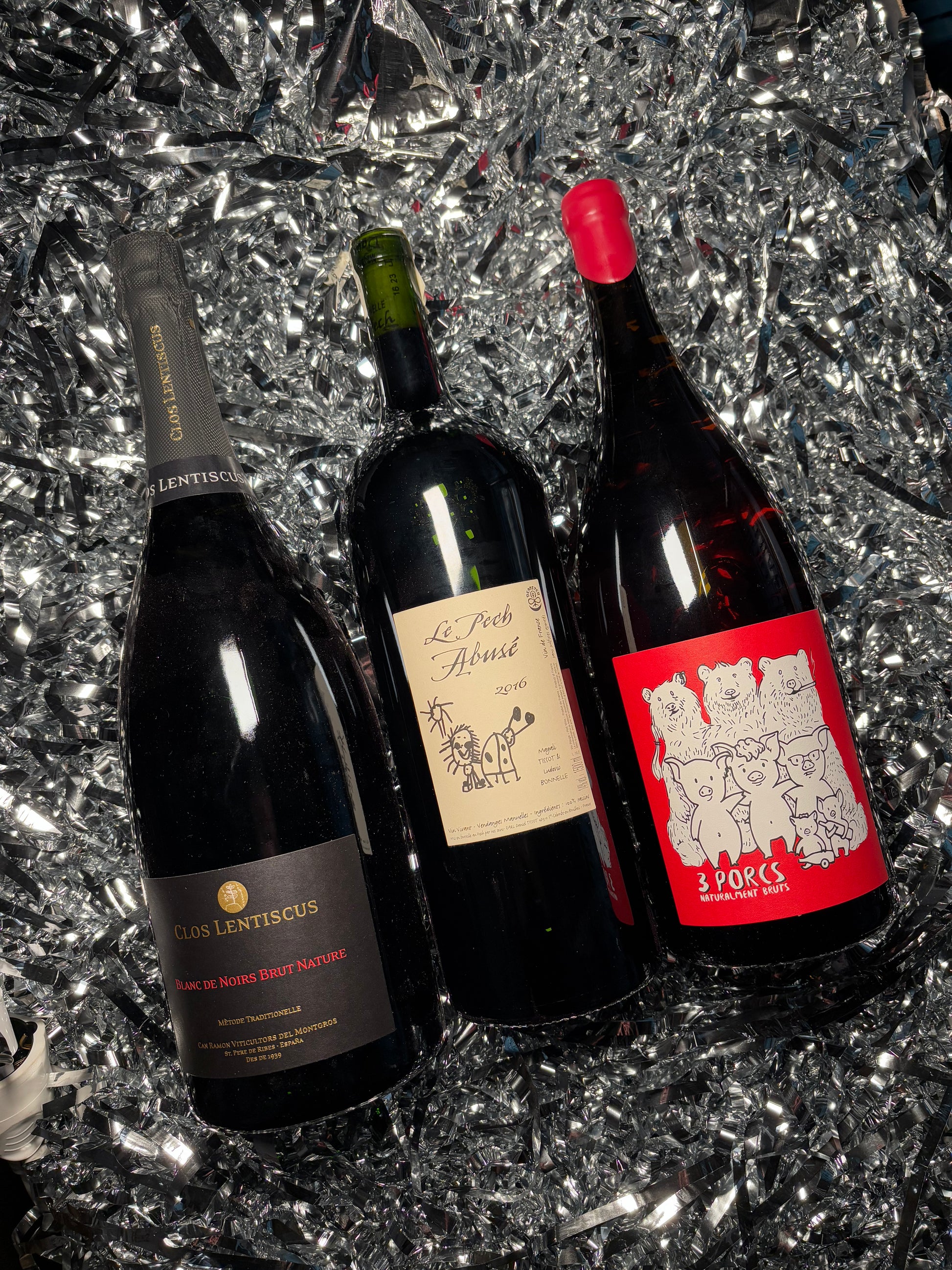 BIG BOTTLES ONLY. The crisp fizz of Blanc de Noirs meets the rustic freshness of Tres Porcs, with Le Pech Abuse bringing it all home: deep, generous, a glass that seems to hum.
